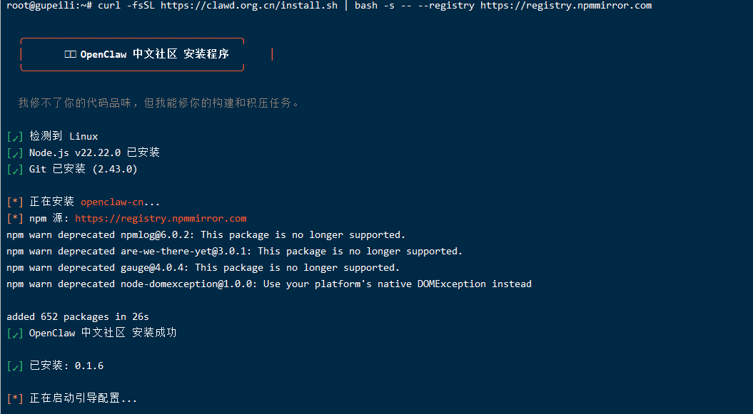 curl -fsSL https://clawd.org.cn/install.sh | bash -s -- --registry https://registry.npmmirror.com